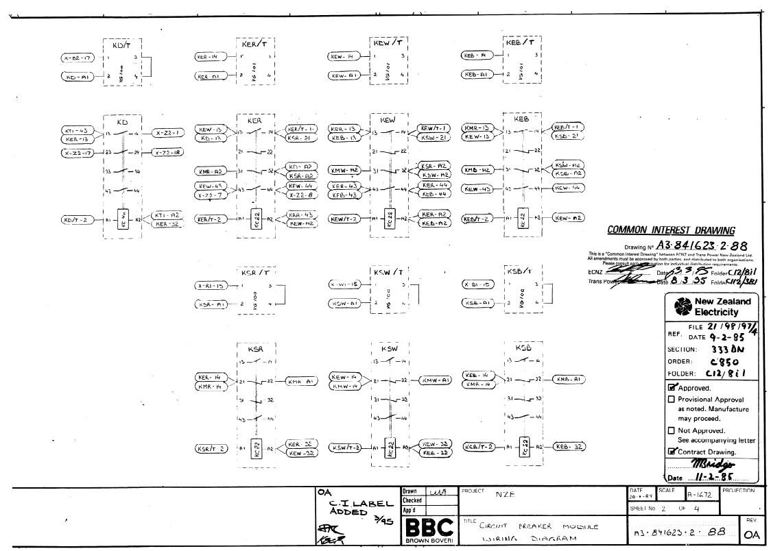 Für ein Wasserkraft-Projekt in Neuseeland wurden schlecht gescannte, meist handgezeichnete Elektrounterlagen aus 1980ern abgezeichnet und damit digitalisiert. Es handelt sich dabei Objekt um die Vorortsteuerschränke einer 220kV gasisolierten Schaltanlage (GIS).